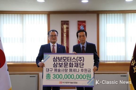 K-Classic News 최지은 기자 | 삼보모터스㈜·삼보문화재단은 연 3천만 원씩 총 3억 원을 대구 문화예술 발전을 위해 대구문화예술진흥원에 기부약정하고 삼보미술상을 제정하여 시상하기로 했다.