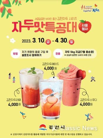 K-Classic News 최지은 기자 | 김천시는 벚꽃 시즌을 맞아 연화지에서 3월 10일부터 4월 30일까지 김천자두로 만든 가공제품을 활용한 시음행사인'자두맛 특공대'를 작년에 이어 올해도 진행한다.