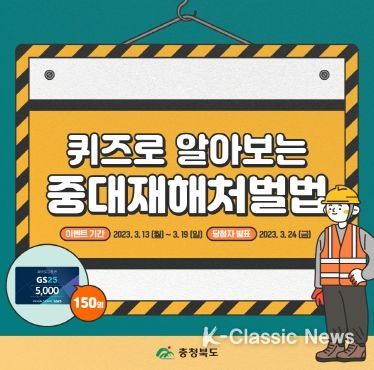 K-Classic News 김성연 기자 | 충북도는 중대재해처벌법 시행 2년차 중대재해 예방의 중요성을 일깨우고, 국민안전의 날(4월 16일)을 맞아 안전문화 조성을 위해 도민을 대상으로‘SNS 초성 퀴즈이벤트’를 3월 13일부터 19일까지 실시한다.