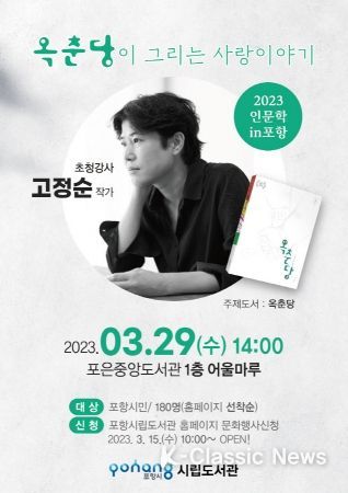 K-Classic News 최지은 기자 | 포항시는 ‘문화가 있는 날’을 맞아 오는 29일 오후 2시 포은중앙도서관 1층 어울마루에서 고정순 작가를 초빙해 ‘인문학 in pohang-인문학에 입문하게’를 진행한다.