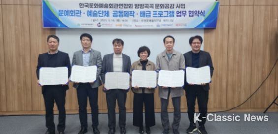 K-Classic News 최지은 기자 | 함안문화예술회관은 14일 서귀포예술의전당 세미나실에서 성주문화예술회관·서귀포예술의전당·고령대가야문화누리·거제시문화예술재단·뉴스테이지와 함께 창작 뮤지컬 ‘청춘연가’ 공동제작·배급을 위한 업무협약을 체결했다.