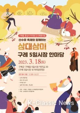 K-Classic News 김성연 기자 | 전남 구례군은 군 대표 축제인 ‘산수유꽃 축제’와 더불어 구례 5일 시장 안에서 ‘산수유 축제와 함께하는 삼대삼미 구례 5일 시장 한마당’행사를 3월 18일 11시 5일시장 야외공연장에서 개최한다고 밝혔다.