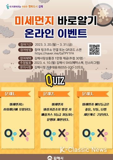 K-Classic News 최지은 기자 | 김해시는 봄철 고농도 미세먼지 대응과 생활 속 미세먼지 줄이기에 시민들의 관심과 참여를 높이고자 ‘미세먼지 바로알기 OX퀴즈 이벤트’를 실시한다고 16일 밝혔다.