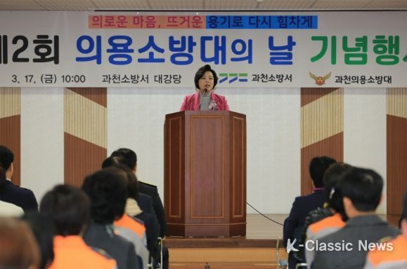 K-Classic News 최지은 기자 | 신계용 과천시장은 17일, 의용소방대의 날(3월 19일)을 앞두고 과천소방서 3층 대회의실에서 열린 ‘제2회 의용소방대의 날’ 기념식에 참석해 과천시 의용소방대원의 헌신과 노고에 감사를 전했다.