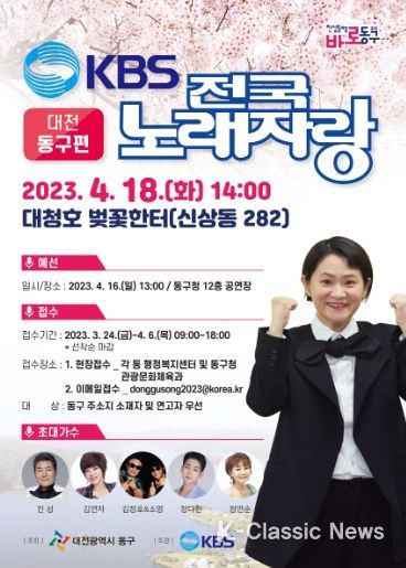 K-Classic News 최지은 기자 | 대전 동구는 4월 18일 오후 2시 대청호 벚꽃한터 특설 무대에서 KBS전국노래자랑 ‘대전 동구편’이 개최된다고 밝혔다.