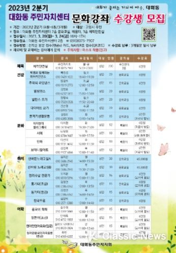 K-Classic News 최지은 기자 | 고양특례시 대화동 주민자치회는 주민들의 문화욕구 충족을 위해 2023년 2분기 문화강좌 수강생을 3월 20일부터 24일까지 모집한다고 밝혔다.
