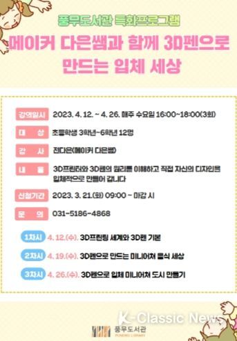 K-Classic News 최지은 기자 | 김포시 풍무도서관은 오는 4월 12일부터 26일까지 매주 수요일 도서관 1층 미래공작소에서 도서관 특화프로그램 ‘메이커 다은쌤과 함께 3D펜으로 만드는 입체 세상’을 운영한다.