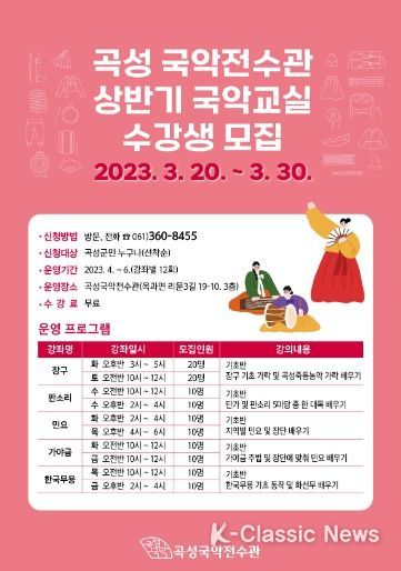 K-Classic News 최지은 기자 | 곡성군이 오는 4월부터 옥과 아름드리나눔센터 국악전수관에서 상반기 국악교실을 시범 운영한다.