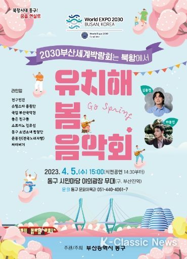 K-Classic News 최지은 기자 | 부산 동구는 2030부산세계박람회 유치를 기원하는 '유치해 봄Go Spring 음악회' 를 4월 5일 시민마당 야외광장(구 부산진역사)에서 개최한다.