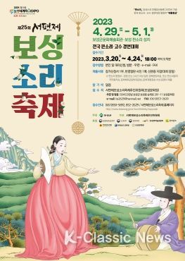 K-Classic News 김성연 기자 | 보성군은 4월 29일부터 5월 1일까지 보성군문화예술회관에서 3일간 ‘제25회 서편제보성소리축제’를 개최한다고 밝혔다. 이번 축제는 제11회 보성세계차엑스포 기간에 열려 풍성한 볼거리를 선사할 것으로 기대된다.