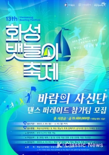 K-Classic News 최지은 기자 | (재)화성시문화재단은 ‘제13회 화성 뱃놀이 축제‘ 개최에 앞서 바람의 사신단 댄스 퍼레이드 경연 참가팀을 모집한다.