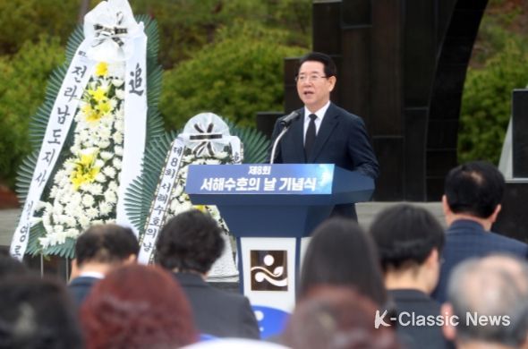 김영록 지사는 기념사에서 “조국 수호를 위해 목숨을 바친 서해수호 영웅들의 애국심 덕분에 이 땅의 자유와 평화가 계속될 수 있었다”며 “한반도의 항구적 평화를 위해서는 강한 국방력과 국민의 안보 의식이 매우 중요하다”고 강조했다.