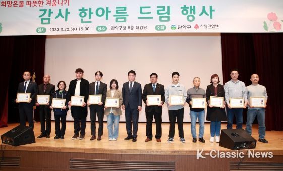 K-Classic News 김성연 기자 | 관악구가 지난 3월 22일 관악구청 대강당에서 ‘감사 한아름 드림’ 행사를 개최, 어려운 이웃을 위해 나눔을 실천한 유공구민에게 감사의 마음을 전했다.