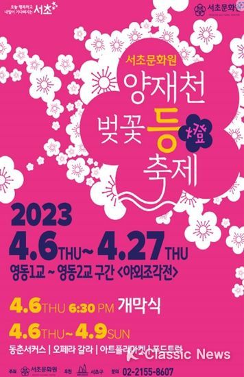 구는 다음 달 6일부터 27일까지 서초문화원과 야간 불빛 속 벚꽃의 운치와 문화공연을 함께 즐기는 '양재천 벚꽃 등(燈) 축제'를 연다. 새달 8일에는 방배본동과 방배2동의 벚꽃 명소에서 문화 행사도 열린다.
