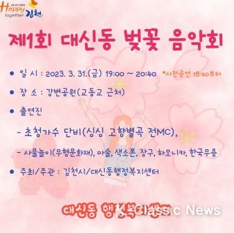 K-Classic News 김성연 기자 | 대신동은 2023년 3월 31일 오후 7시부터 강변공원(교동교 아래)에서 '제1회 대신동 벚꽃 음악회'를 개최한다.