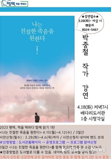 K-Classic News 최지은 기자 | 평택시 시민독서운동 '평택, 책을 택하다' 2023년 함께 읽는 책 '나는 친절한 죽음을 원한다' 박중철 작가 강연이 오는 4월 18일 화요일 저녁 7시에 배다리도서관에서 진행된다.