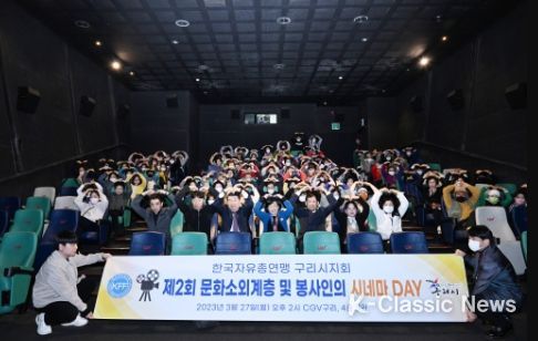 K-Classic News 최지은 기자 | 구리시는 지난 27일 CGV 구리점에서 한국자유총연맹 구리시지회가 주관하여 취약계층과 자원봉사자 120여 명을 대상으로 ‘제2회 문화소외계층 및 봉사인의 시네마 DAY’를 개최했다고 밝혔다.