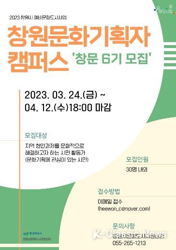 K-Classic News 최지은 기자 | 창원특례시와 창원시문화도시지원센터는 창원예비문화도시사업의 일환으로 ‘창원 문화기획자 캠퍼스-창문6기’ 교육생을 4월 12일까지 모집한다고 29일 밝혔다.