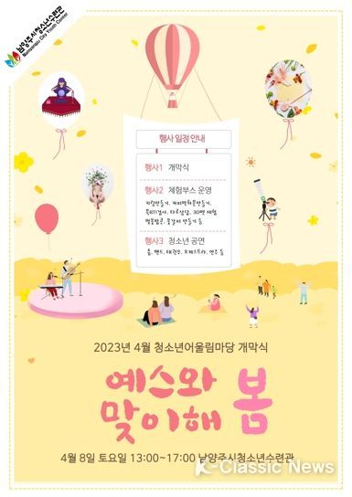 K-Classic News 이호민 기자 | 남양주도시공사 남양주시청소년수련관에서는 남양주시 청소년과 시민들에게 문화예술공연, 체험활동 등 다양한 즐길거리를 제공하고 건전한 여가생활을 지원하는 2023년도 첫 번째 청소년어울림마당을 YES와 맞이해‘봄’ 주제로 오는 4월 8일 13:00시부터 17:00까지 남양주시청소년수련관 주차장에서 개최한다고 밝혔다.