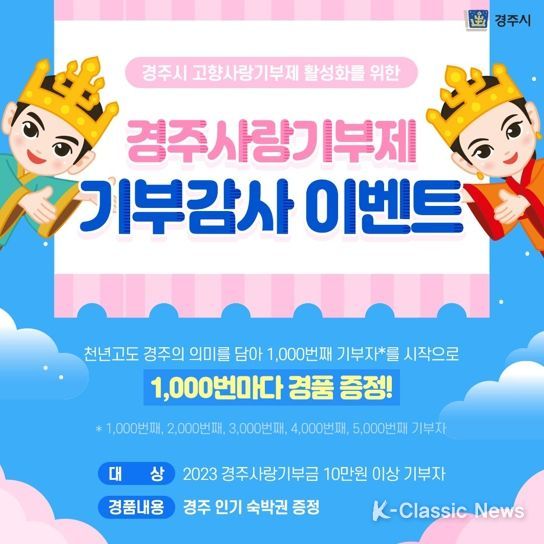K-Classic News 이호민 기자 | 경주시가 고향사랑기부제의 관심도를 높이기 위해 기부감사 이벤트를 펼친다.
