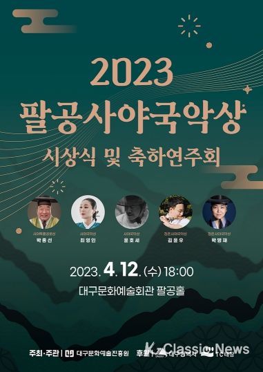 K-Classic News 최지은 기자 | 대구문화예술진흥원은 2023 팔공사야국악상 시상식 및 축하 연주회를 오는 4월 12일 오후 6시 대구문화예술회관 팔공홀 무대에 올린다.