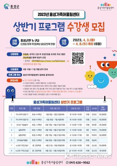 K-Classic News 이호민 기자 | 홍성가족어울림센터가 언제 어디서든 배울 수 있는 양질의 문화교육 프로그램을 제공하기 위해 오는 4월 8일까지 상반기 프로그램 수강생을 모집한다.