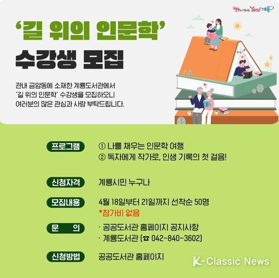 K-Classic News 이호민 기자 | 계룡시는 관내 금암동에 소재한 계룡도서관에서 ‘길 위의 인문학’ 수강생을 모집한다고 밝혔다.