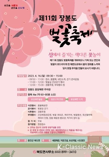 K-Classic News 김성연 기자 | 옹진군은 오는 16일 벚꽃이 만개한 아름다운 장봉도에서 벚꽃축제를 개최한다고 밝혔다.