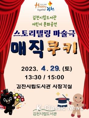 K-Classic News 최지은 기자 | 김천시립도서관에서는 다가오는 가정의 달을 맞아 4.29(토요일) 13:30, 15:00 2회에 걸쳐 시립도서관 시청각실에서 스토리텔링 어린이 마술 극 ‘매직 쿠키’를 공연한다.