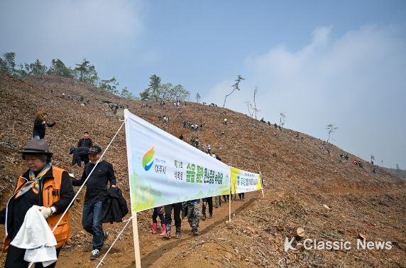 K-Classic News 최지은 기자 | 여주시는 7일 금사면 하호리 산2-1 일원에서 국토녹화 50주년을 기념하는 제78회 식목일 나무심기 행사를 개최했다. 이날 행사에는 여주시장을 비롯하여 시의원, 유관기관, 사회단체장 및 시민 등 450 여명이 참석한 가운데, 미래를 향한 경제림 조성을 목적으로 물푸레나무 3,000본(1ha)를 식재했다.