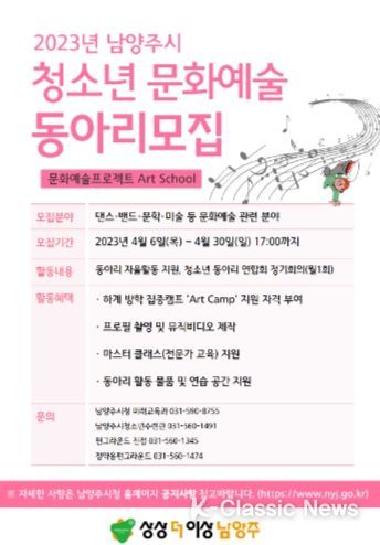 K-Classic News 최지은 기자 | 남양주시는 문화예술 분야에 관심 있는 청소년에게 체험의 기회를 제공하고, 미래세대의 전문 인재로 성장할 수 있는 발판을 마련해주고자 청소년 문화예술 동아리 아트스쿨을 운영한다고 7일 밝혔다.