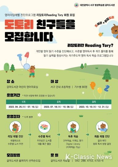 K-Classic News 이호민 기자 | 대전 서구 갈마도서관은 관내 초등학생을 대상으로 맞춤형 영어 독서학습 지원 프로그램인 ‘영어리딩레벨 진단프로그램’을 운영한다.