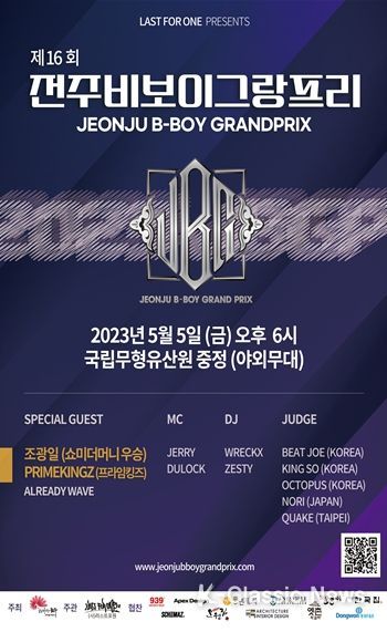 전주시와 (사)라스트포원은 오는 5월 5일 오후 6시 국립무형유산원 중정 야외무대에서 ‘제16회 전주비보이그랑프리’를 개최한다.
