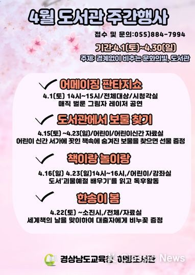 K-Classic News 이호민 기자 | 경남도교육청 하동도서관은 제59회 도서관 주간을 맞아 ‘경계 없이 비추는 문화의 빛, 도서관’을 주제로 4월 한 달간 풍성한 독서문화 행사를 마련한다고 11일 밝혔다.