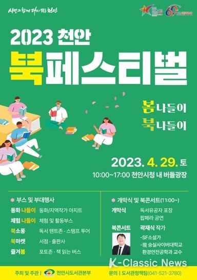 K-Classic News 이호민 기자 | 천안시도서관본부가 오는 29일 천안시청 내 버들광장에서 대표 책 문화 축제인 ‘2023 천안 북페스티벌’을 개최한다고 밝혔다.