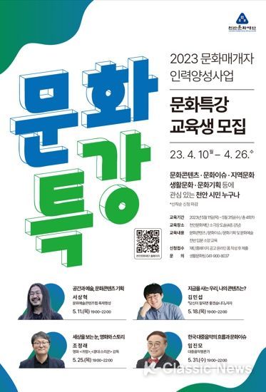K-Classic News 이호민 기자 | 천안문화재단은 창의적인 지역 문화 인재 발굴과 시민 주체적 문화생태계 조성을 위한 ‘2023년 문화매개자 인력양성사업’을 실시한다고 11일 밝혔다.