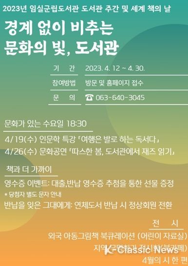 K-Classic News 이호민 기자 | 임실군립도서관이 4월 12일부터 30까지‘경계 없이 비추는 문화의 빛, 도서관’이라는 주제로 제59회 도서관 주간 행사를 운영한다.