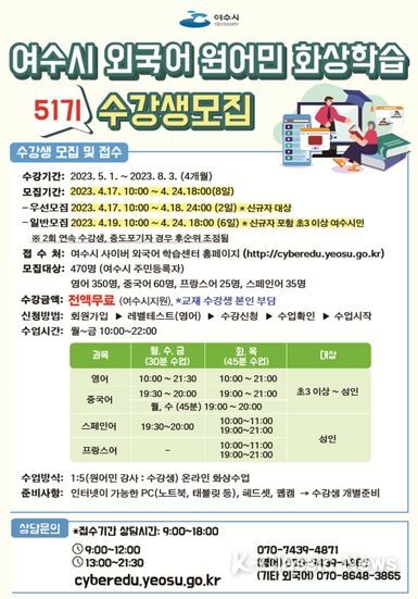 K-Classic News 이호민 기자 | 여수시가 오는 17일부터 24일까지 ‘여수시 외국어 원어민 화상학습’ 수강생 470명을 모집한다고 밝혔다.