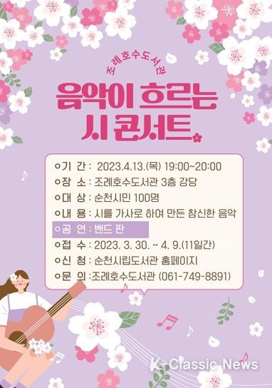 K-Classic News 이호민 기자 | 순천시립조례호수도서관은 오는 13일 오후 19시 조례호수도서관 강당에서‘음악이 흐르는 시 콘서트’를 주제로 공연을 연다.