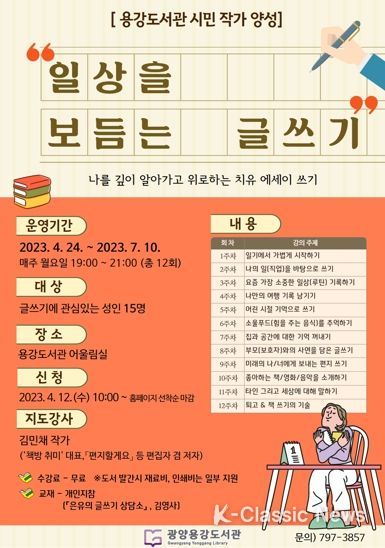 용강도서관은 오는 12일부터 광양시립도서관 누리집에서 글쓰기에 관심 있는 성인을 대상으로 선착순 15명을 모집한다.