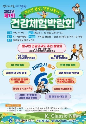K-Classic News 최지은 기자 | 광주 동구는 오는 13일 오후 3~5시 5·18민주광장에서 ‘동구민 건강체험 박람회’를 개최한다고 밝혔다.
