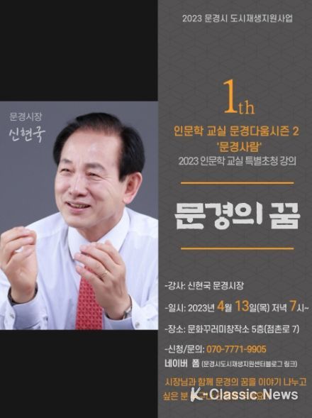 K-Classic News 진금하 기자 | 문경시 도시재생지원센터는 4월 13일(목) 저녁 7시 문화꾸러미창작소 5층에서 신현국 시장님을 모시고 ‘문경의 꿈’이라는 주제로 인문학 교실 문경다움 시즌2를 진행한다.