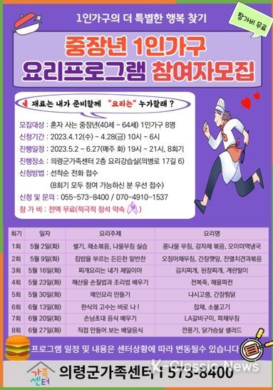 K-Classic News 이호민 기자 | 의령군가족센터는 5월 2일부터 6월 27일까지 매주 화요일 총 8회에 걸쳐 중장년(40~64세) 1인가구 요리교실 프로그램 참여자 8명을 모집한다고 밝혔다.