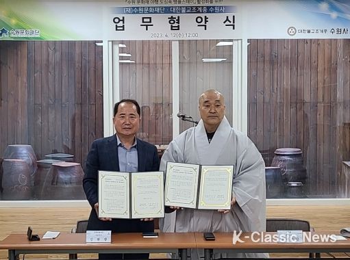 K-Classic News 최지은 기자 | 수원문화재단은 12일 대한불교조계종 수원사와 2023 수원 문화재 야행의 성공적인 추진 및 수원사 템플스테이 프로그램 활성화를 위한 업무협약을 체결했다.