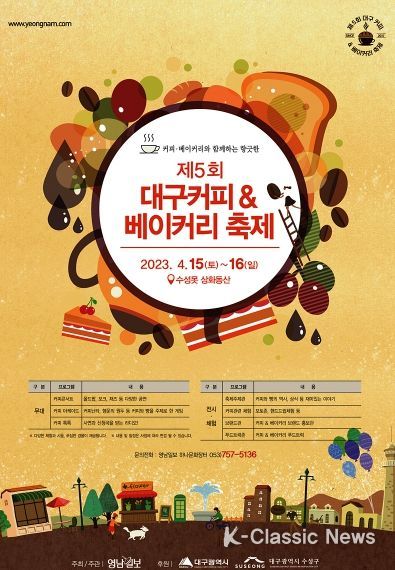 K-Classic News 최지은 기자 | 영남일보가 주최·주관하고 대구광역시가 후원하는 제5회 대구 커피&베이커리 축제가 4월 15일 ~ 16일 이틀 동안 4년 만에 수성 유원지(상화동산 등) 일원에서 열린다.