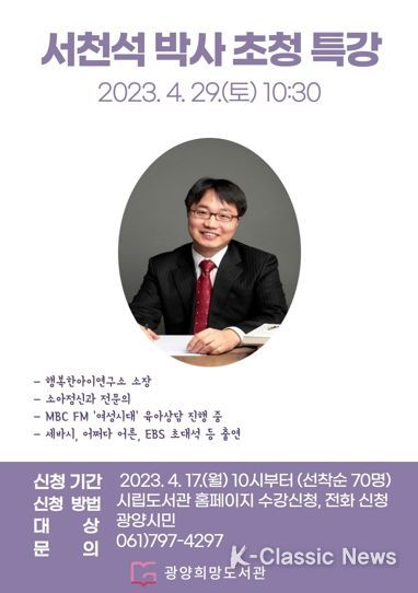 K-Classic News 이호민 기자 | 광양희망도서관은 오는 29일 토요일 오전 10시 30분 도서관 3층 꿈나무극장에서 서천석 박사를 초청해 부모교육 특강을 연다.