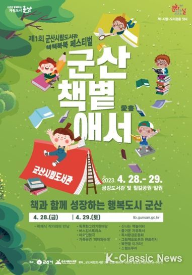 K-Classic News 이호민 기자 | 군산시립도서관은 '책과 함께 성장하는 행복도시 군산'을 비전으로, 온가족이 함께 참여해 책과 문화를 즐길 수 있는 '제1회 책책북북 페스티벌'군산.책볕.애서(愛書)''를 오는 28일부터 29일까지 이틀간 금강도서관 및 철길공원 일원에서 개최한다.