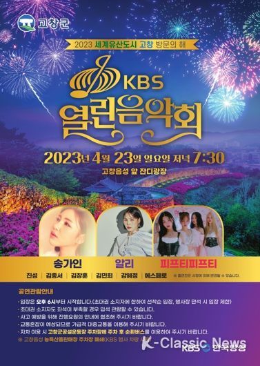 K-Classic News 이호민 기자 | 고창군이 오는 23일 고창읍성 잔디광장에서 군민 모두가 하나 되는 ‘KBS 열린음악회’를 개최한다고 밝혔다.