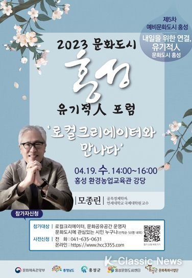 K-Classic News 이호민 기자 | 홍성문화도시센터는‘로컬크리에이터와 만나다’라는 주제로 『문화도시 홍성 유기적人 1차 포럼』을 4월 19일(수) 오후 2시 홍성 환경농업교육관에서 개최한다.