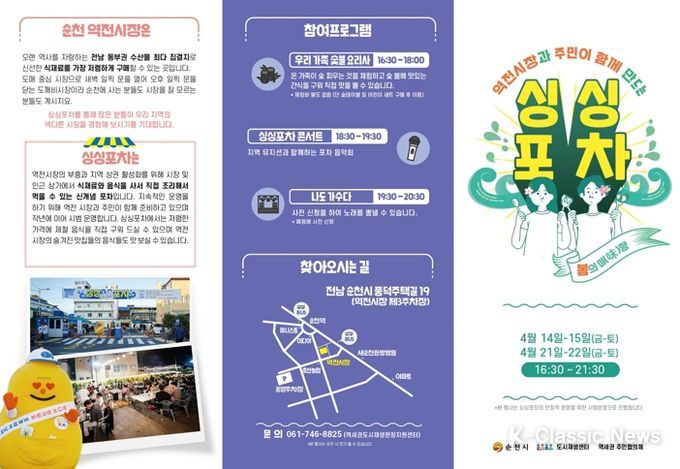 K-Classic News 이호민 기자 | 순천시는 역세권 도시재생사업의 일환으로 '싱싱포차 : 봄의 미향' 행사를 14일부터 2주간 진행한다. 이번 축제는 금·토요일 오후 4시 30분부터 9시 30분까지 운영하며 역전시장 제3주차장(전남 순천시 풍덕주택길 19)에서 열린다.